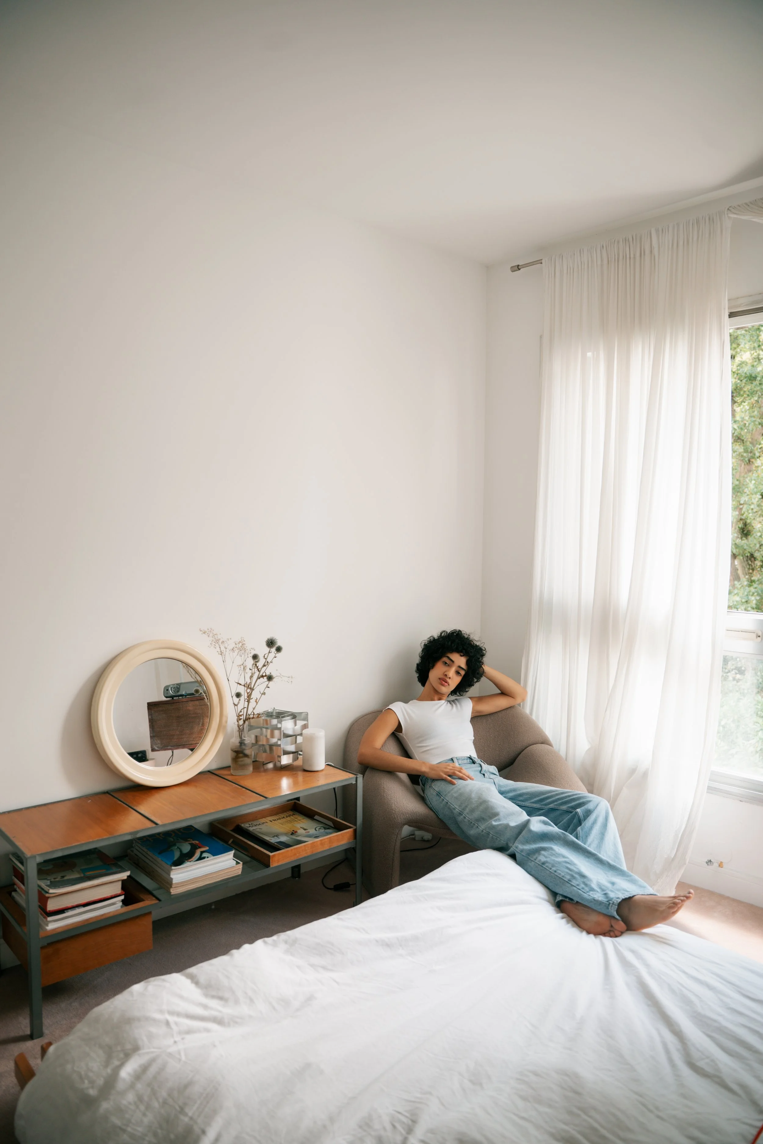 Cet appartement à la déco blanche et crème offre une ambiance douce, élégante et contemporaine. Sa lumière naturelle et ses meubles épurées en font un lieu parfait pour des portraits autant intimistes qu’édito.